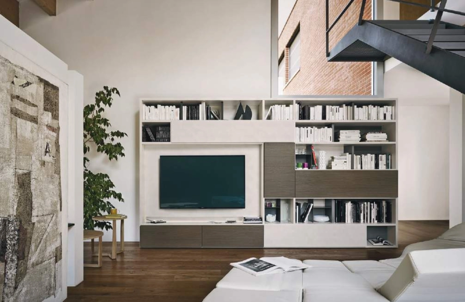 Il noto e conosciuto brand produce Librerie a muro moderne in una vasta scelta di forme, misure, finiture e tonalità per garantire la massima versatilità. Scopri le più originali soluzioni salvaspazio, come lalibreria nell'immagine in materico, e dai vita al living operativo e pratico che hai sempre voluto. Potrai utilizzare questi mobili come una superficie di appoggio plurifunzionale, per riporci sia oggetti d'uso quotidiano, sia prettamente decorativo. Contattando i nostri arredatori potrai avere info di ogni genere sulla Libreria Modo Composizione M6C73 di Sangiacomo qui disponibile.