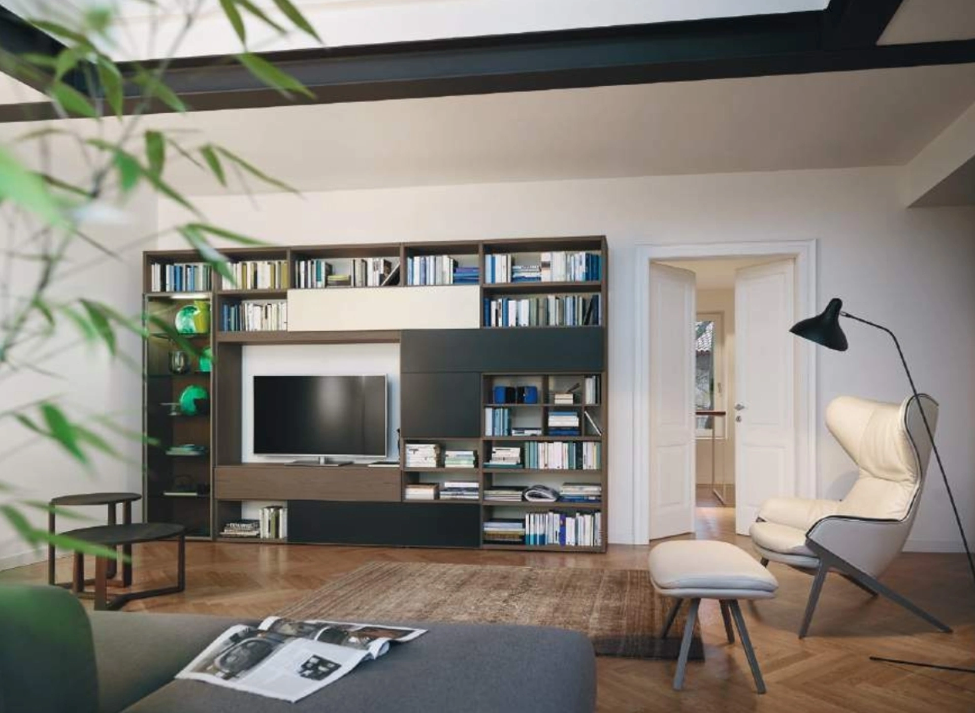 Le Librerie a muro Sangiacomo sono disponibili in differenti forme: ad angolo, lineari, sospese e realizzabili su misura con differenti componenti, mensole e vani. Il soggiorno è, in assoluto, la zona della casa dove ci si dedica al relax ogni giorno, facendo due chiacchiere con amici e parenti, riposando da soli o guardando la televisione. Contattaci per info e preventivi sul modello visibile in foto: se vuoi completare stanze moderne, allora questa libreria dalle linee decise fa per te. Le Librerie moderne sono sempre tanto amate per progettare il soggiorno e i muri, unendo al meglio doti di praticità e design.