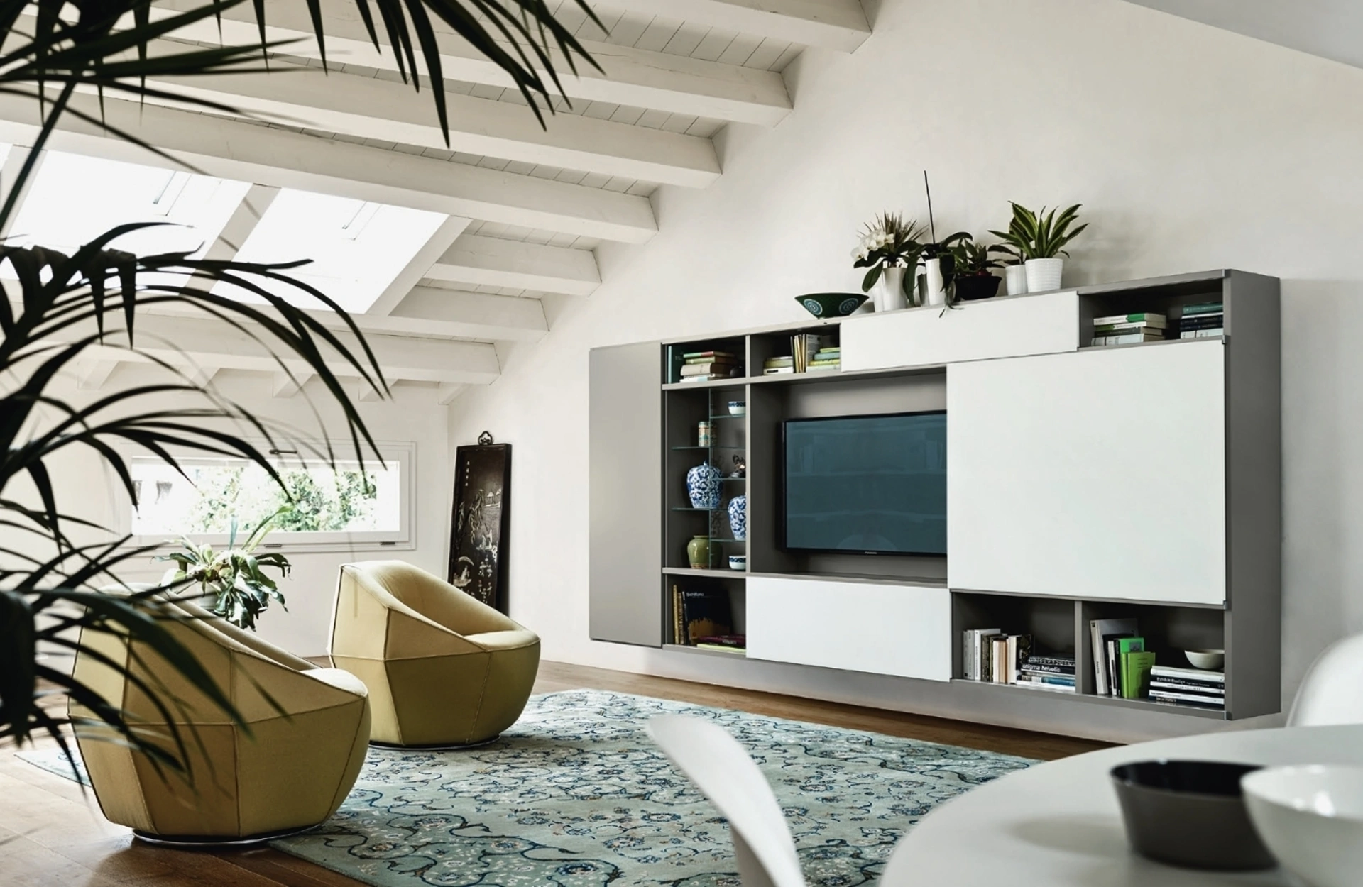I mobili soggiorno in laccato opaco dalle linee moderne come il modello nell'immagine sono davvero poliedrici e capaci di progettare il soggiorno sfruttando bene ogni angolo. Sangiacomo offre a catalogo inediti modelli di mobili soggiorno, diversi per stile e conformazioni, finiture e elementi: scopri nel nostro punto vendita l'Arredamento Casa delle migliori marche. La Parete Attrezzata Modo M6C75 di Sangiacomo nell'immagine è una delle più originali soluzioni d’arredo sul mercato: l'alta componibilità e le varie opportunità di progettazione la rendono funzionale ed esteticamente gradevole. Poiché il soggiorno deve essere uno spazio agevole e bello da vedere, sono molto utili alcuni arredi belli e funzionali come le Pareti Attrezzate.