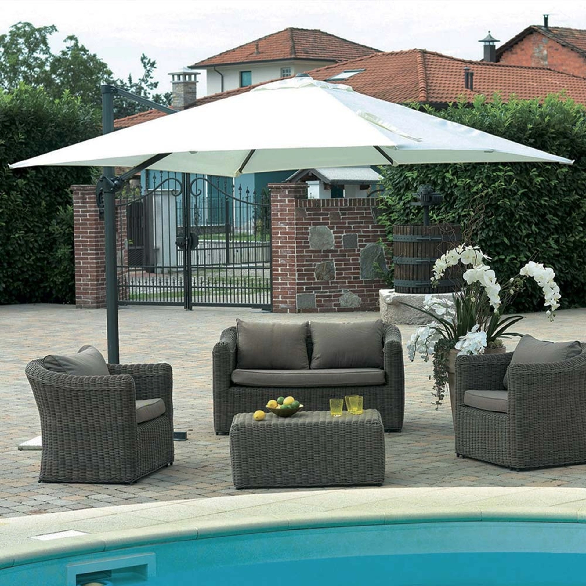 Per godere di ampi spazi verdi o di terrazzini open air, l’Arredo Giardino va studiato anche nei particolari, affinchè risulti sempre bello a vedersi e funzionale. L’Arredo Giardino è da progettare con la medesima attenzione dedicata al progetto degli ambienti della nostra abitazione, affinchè risulti un giardino ben progettato. Il marchio La Seggiola vanta di una pluriennale professionalità nel settore ed è sempre sensibile all’evolversi del gusto in fatto di arredo per gli spazi outdoor. Agli arredi per lo spazio all'aperto che presentiamo in negozio potete chiedere estetica e funzionalità, come sa dimostrare questa linea di ombrelloni in metallo.